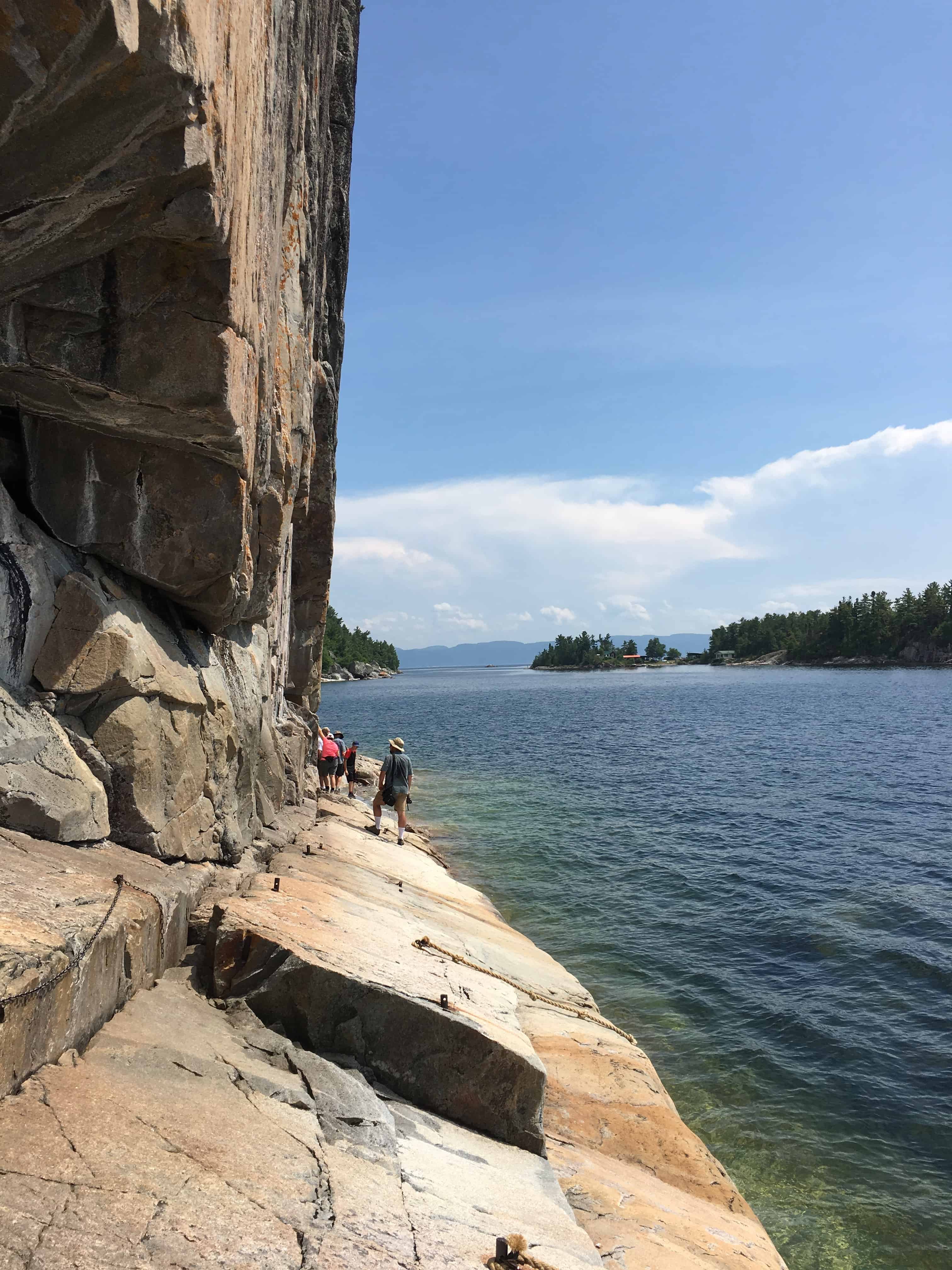 The next day, duplicating our relaxed pace, we stopped at Lake Superior Provincial Park after a mere 118 km down the road, then hiked in to the Agawa Pictograph Site where Mishipeshu, the great water lynx, resides. On a rock overlooking the vast lake we waved at kayakers navigating its clear blue waters while enjoying a tasty lunch packed by Susan. Well, you just don’t want to leave, so, you know… we didn’t.